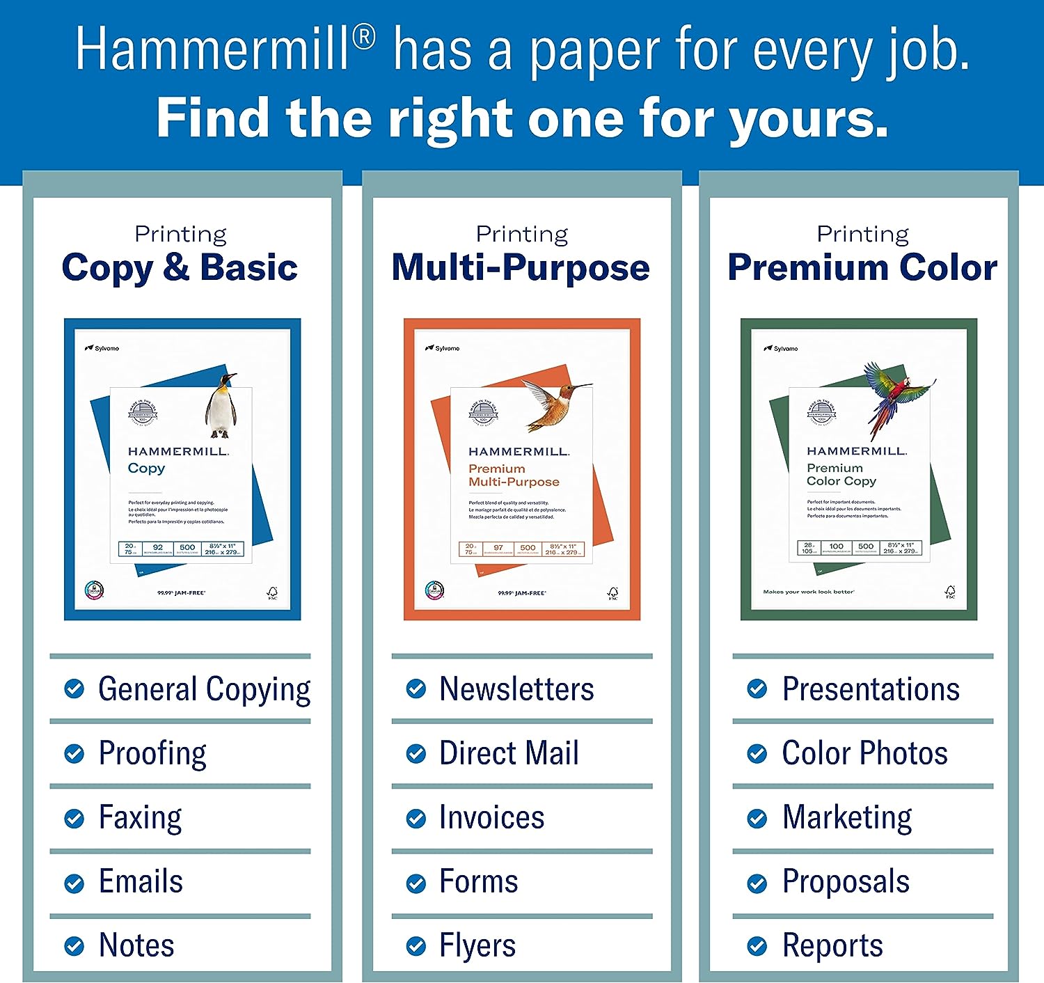 • OTHER PAPER OPTIONS: Scroll down to compare Hammermill print and copy paper for every purpose, including premium presentation-quality color copy paper, cover-weight paper stock, and glossy paper for photo printing