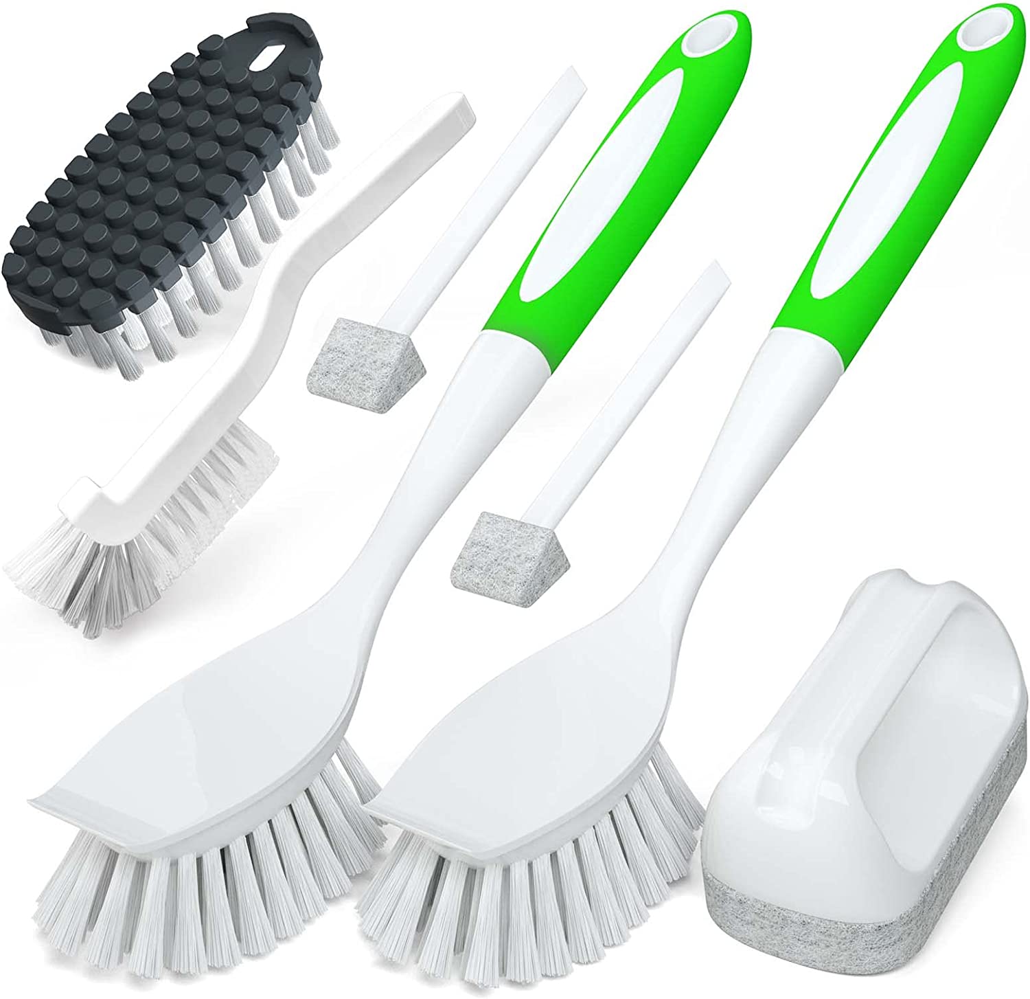 • ????【 7 Pack Kitchen Dish Brushes 】- All purpose to use, including Kitchen Dish Brush×2, Bendable Kitchen Brush×1, Scouring Pad Brush×1, Tile Lines Brush×1, Groove Gap Brush×2